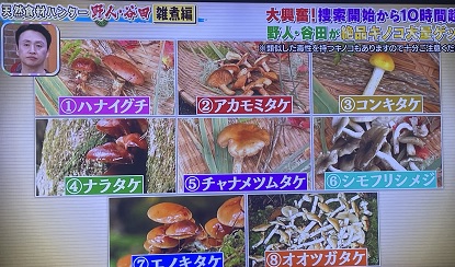 @ウスキキヌガサタケ、A菌輪(マントカラカサタケ)、Bタマゴタケ、Cシイタケ、D冬虫夏草、E雷キノコ、F有用キノコ(ヤマブシタケ、ハナビラタケ)、Gショウロ、Hツクリタケ(マッシュルーム)、I外来品種(エリンギ、バイリング)、J光るキノコ(シイノトモシビタケ)、Kマツタケ、L派手キノコ(タモギタケ、トキイロヒラタケ)、Mオオシロアリタケ、N薬用キノコ(ベニクスノキタケ、ヒメマツタ、カバノアナタケ)